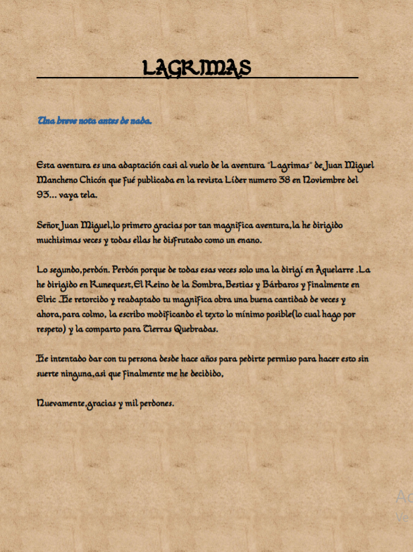 Es posible que algunos jugadores quieran jugar las aventuras de los míticos Stormbringer o Elric con las reglas de Tierras Quebradas o al revés. Para facilitarlo he creado una guía de conversión de dos páginas con la colaboración de Gathalinay.